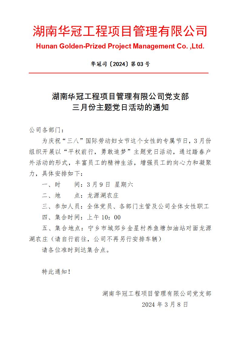 湖南華冠工程項(xiàng)目管理有限公司黨支部三月份主題黨日活動(dòng)的通知